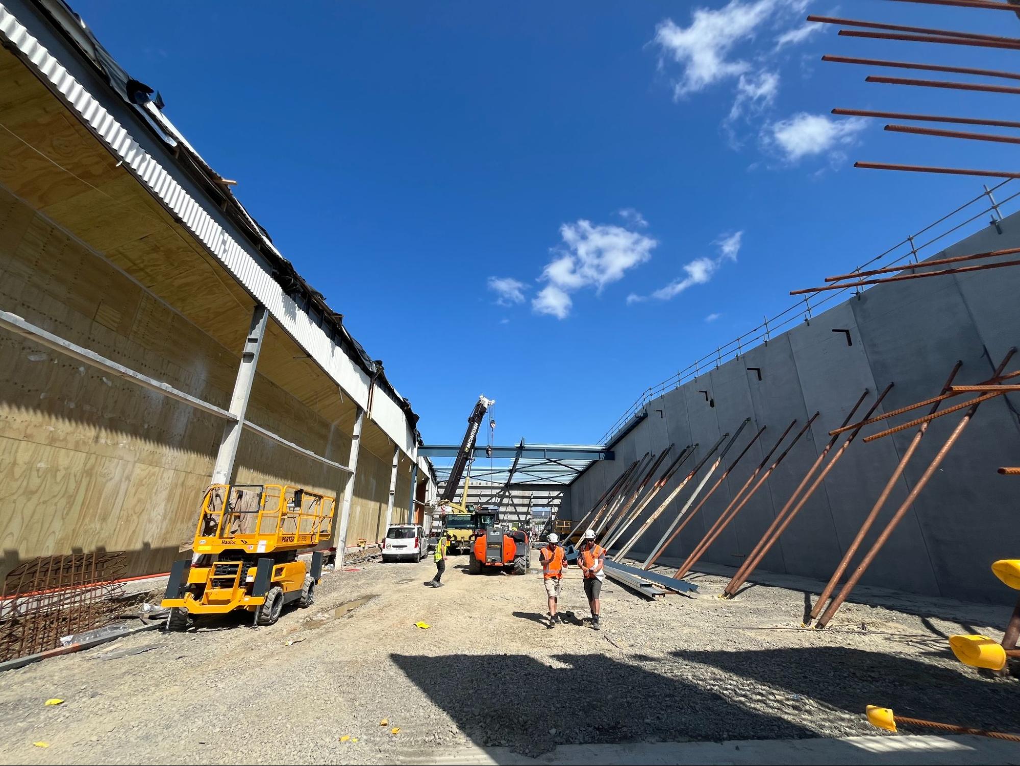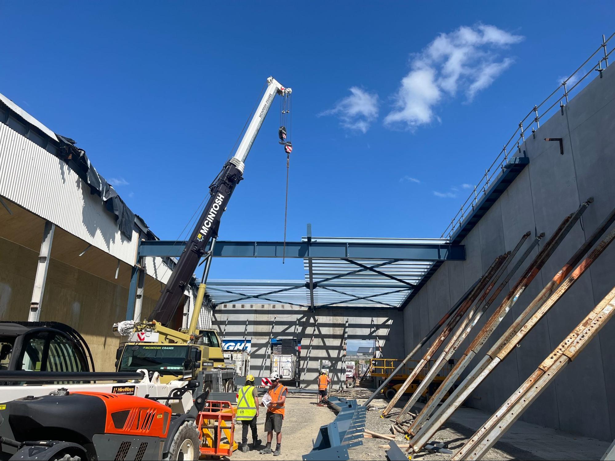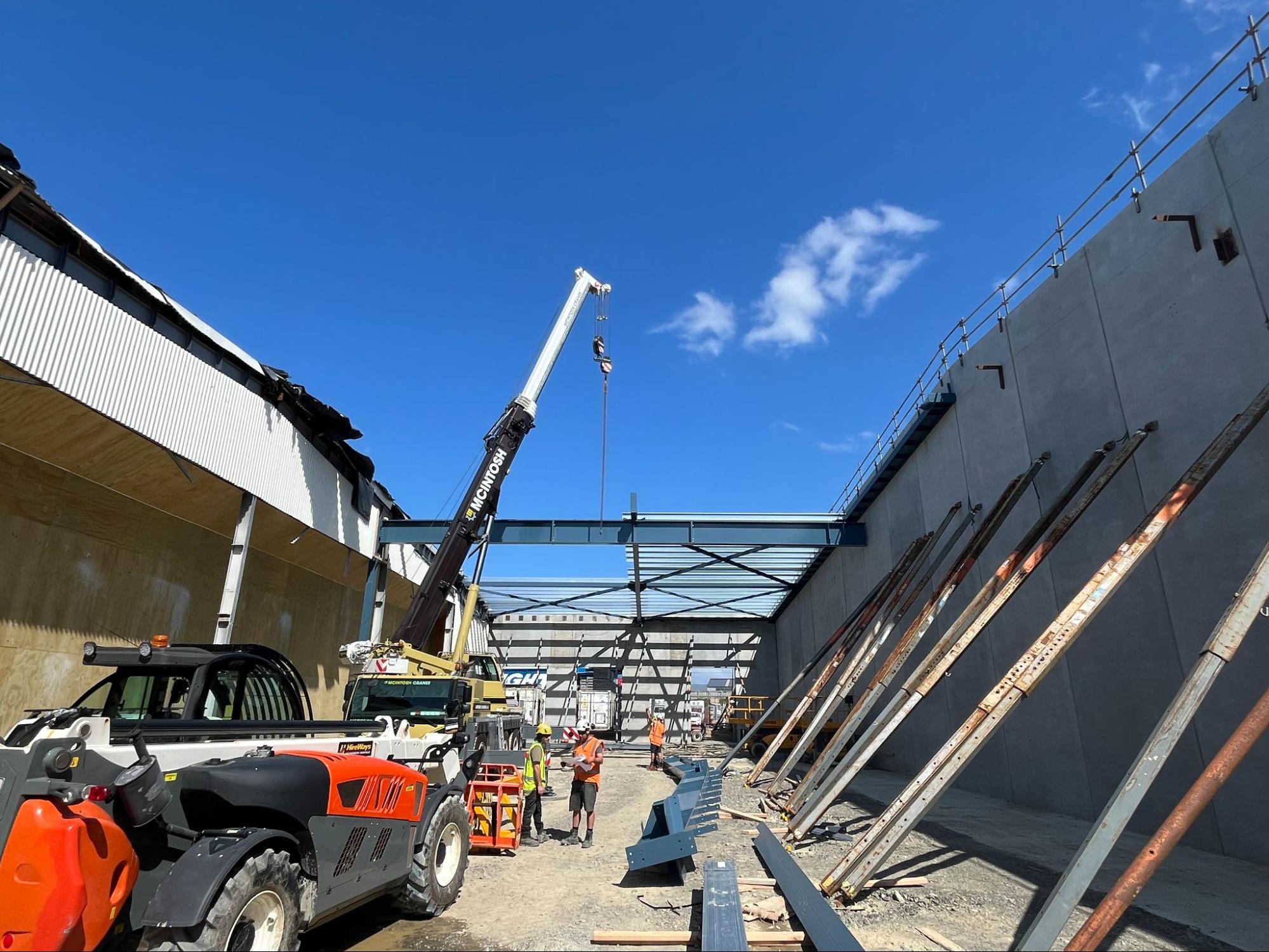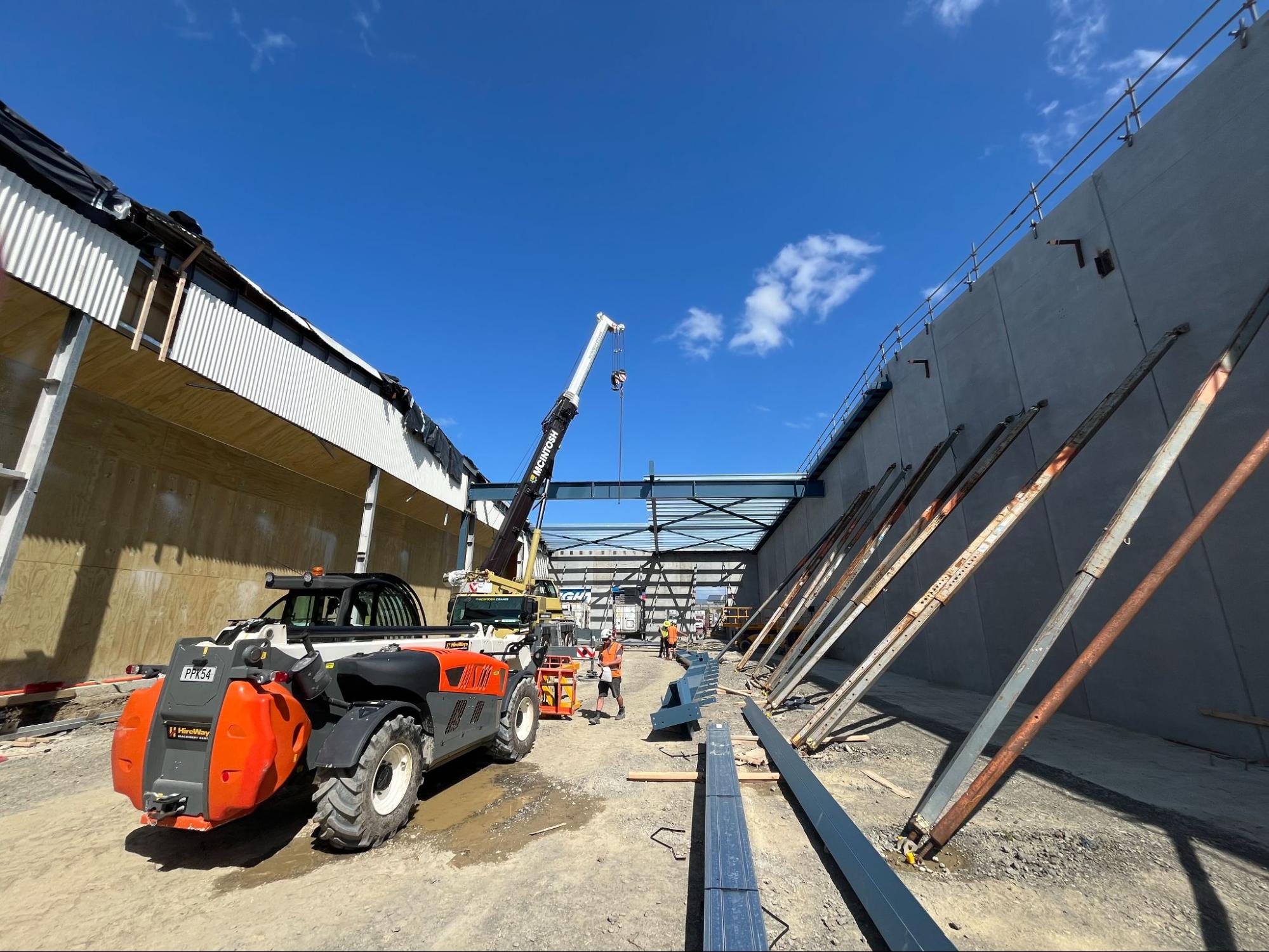 The first stage – an 80-tonne, 2,240m² extension – expanded the existing warehouse and retail footprint. The second stage, now underway, involves seismic strengthening works requiring 100 tonnes of steel. The challenge lies in installing heavy roof members, chillers, and entranceway reinforcements while keeping the retail store operational.